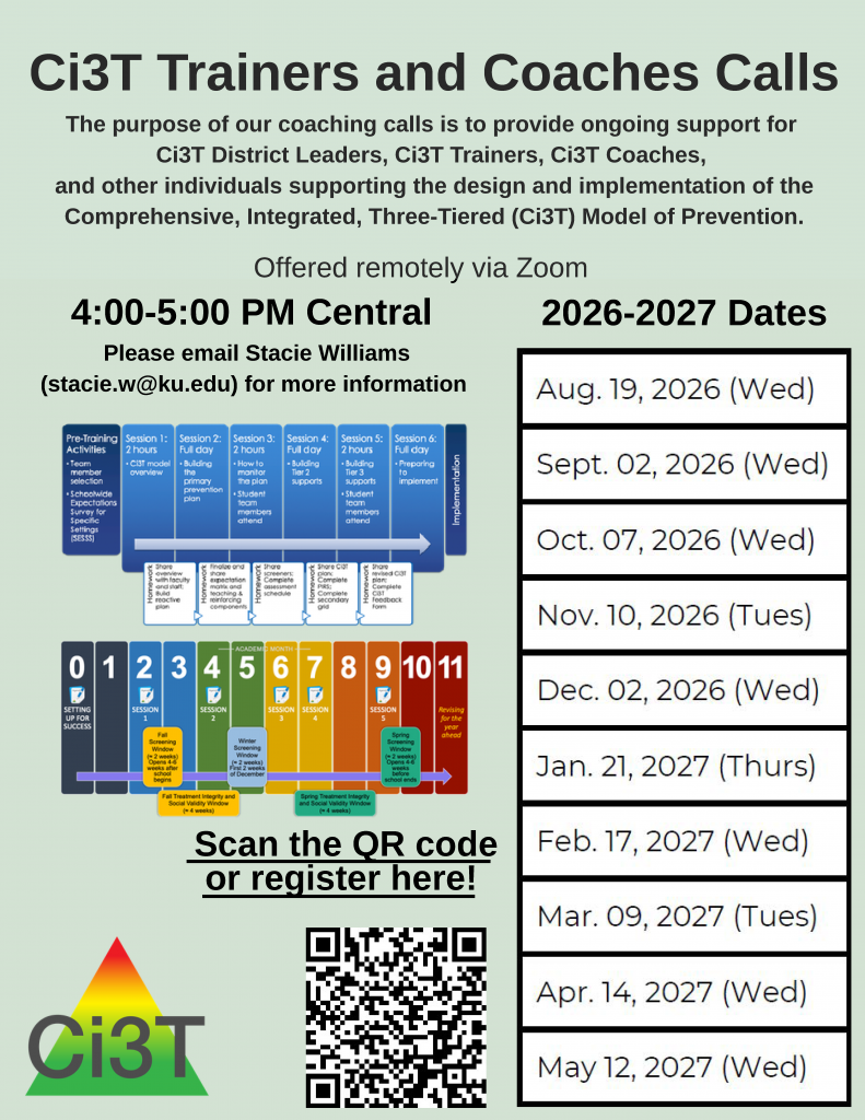 The purpose of our coaching calls is to provide ongoing support for Ci3T District Leaders, Ci3T Trainers, Ci3T Coaches, and other individuals supporting the design and implementation of Ci3T. We offer these calls as a service activity to support those committed to meeting students’ multiple needs in academic, behavior, and social domains. Open to all interested parties — to join these calls, please register here!
